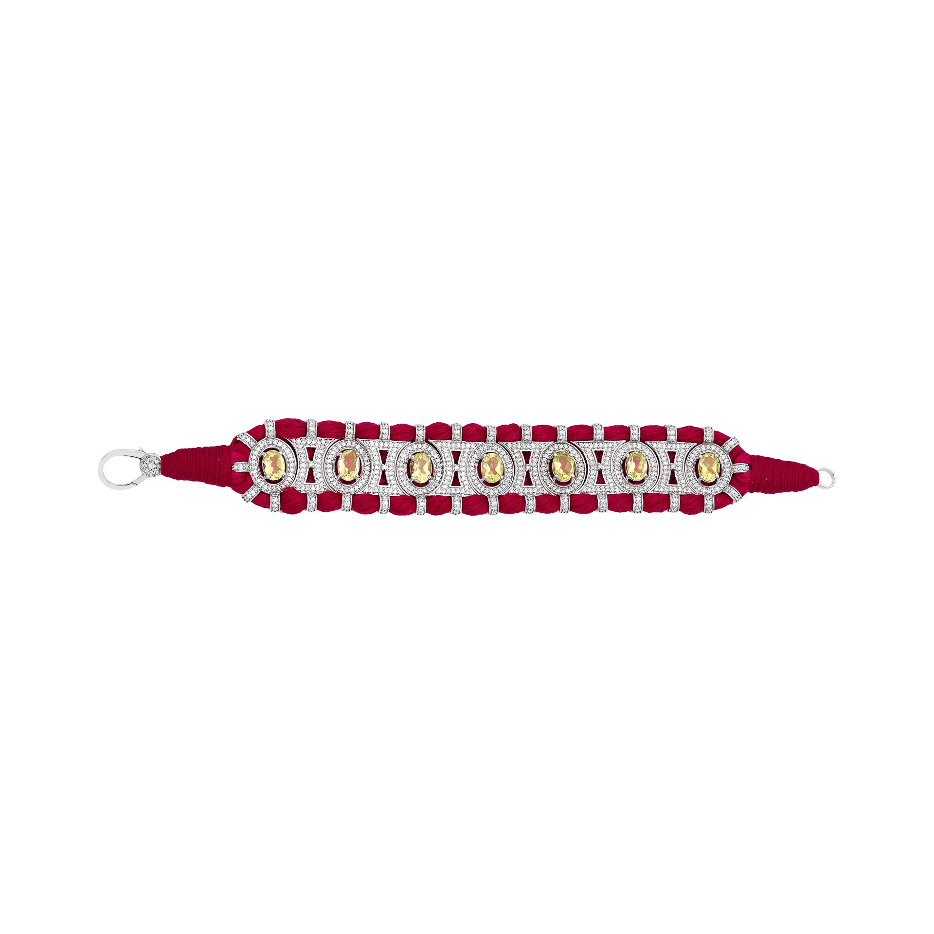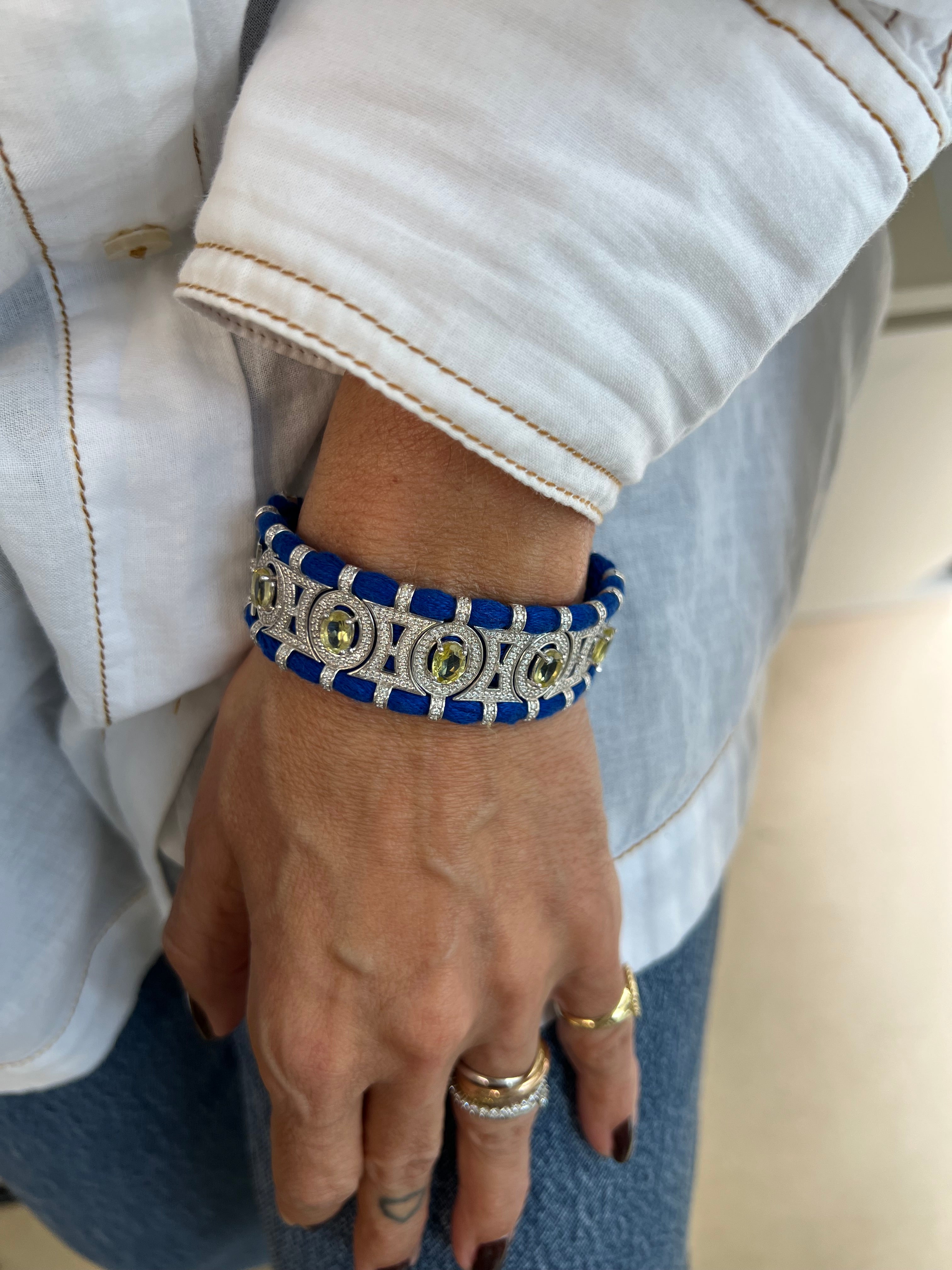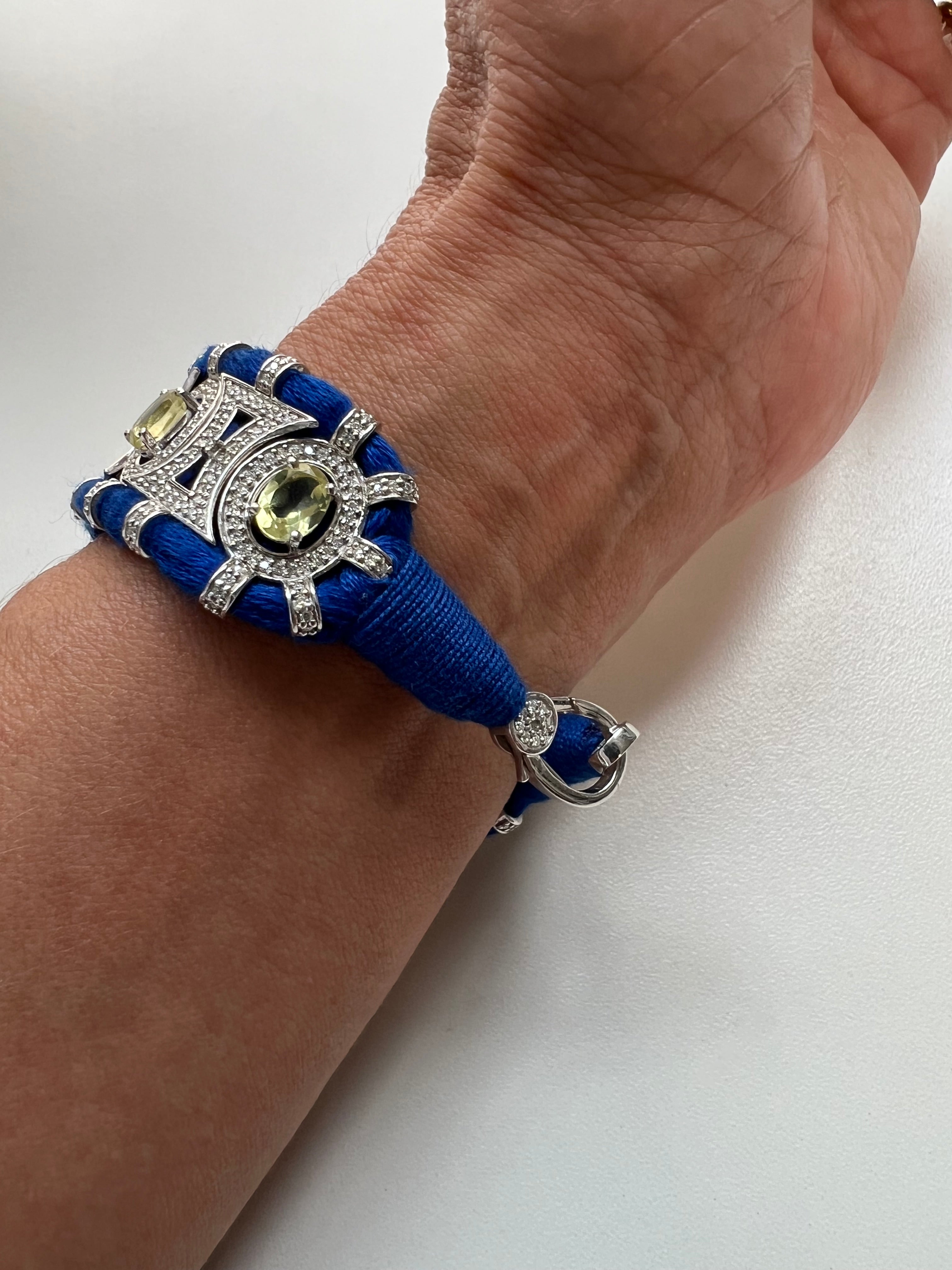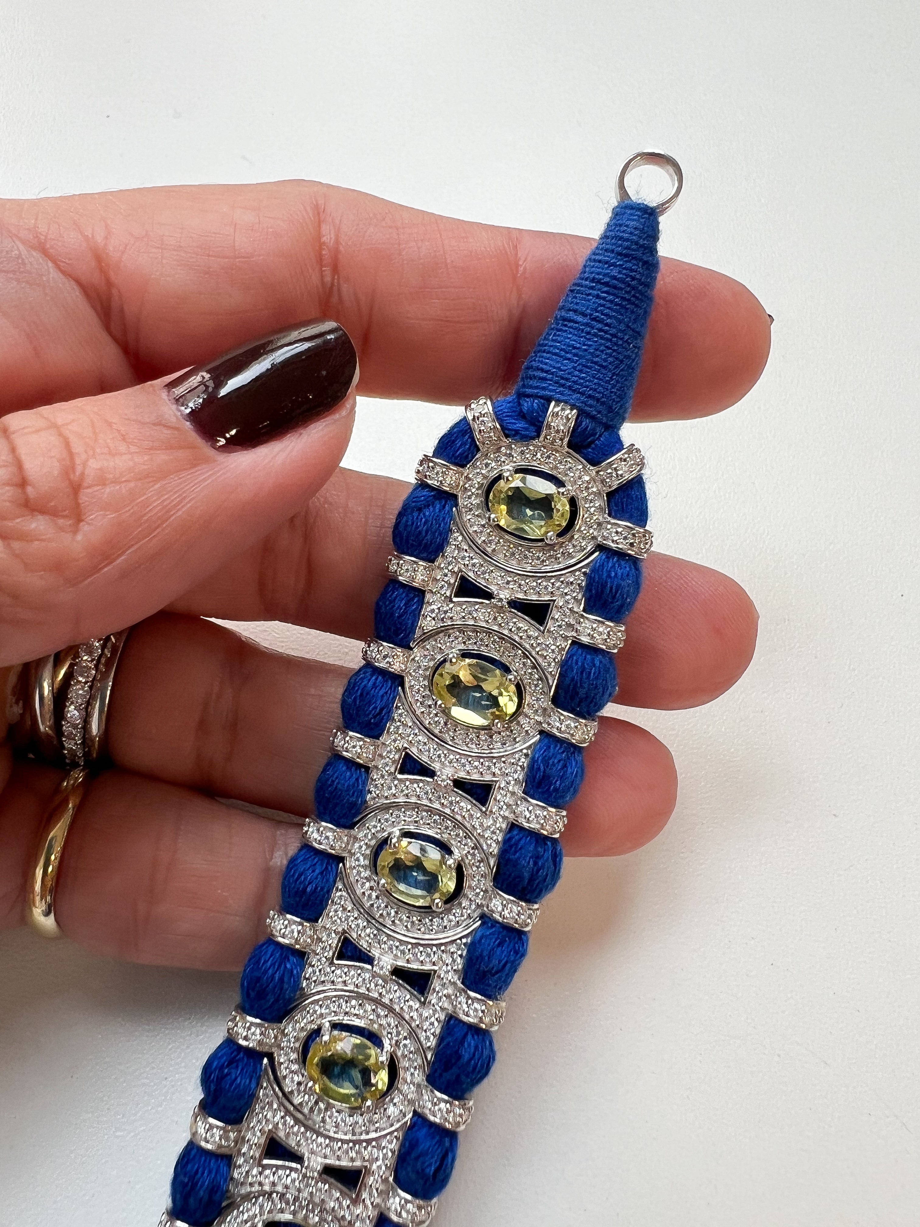 A pulseira Tuty é uma joia artesanal feita com fio de algodão azul e prata 925 banhada em ródio. Possui pedras moissanites e citrinos naturais, com um elegante fecho alpino cravejado. Com 17 cm de comprimento, é uma escolha sofisticada para um toque de brilho em qualquer look