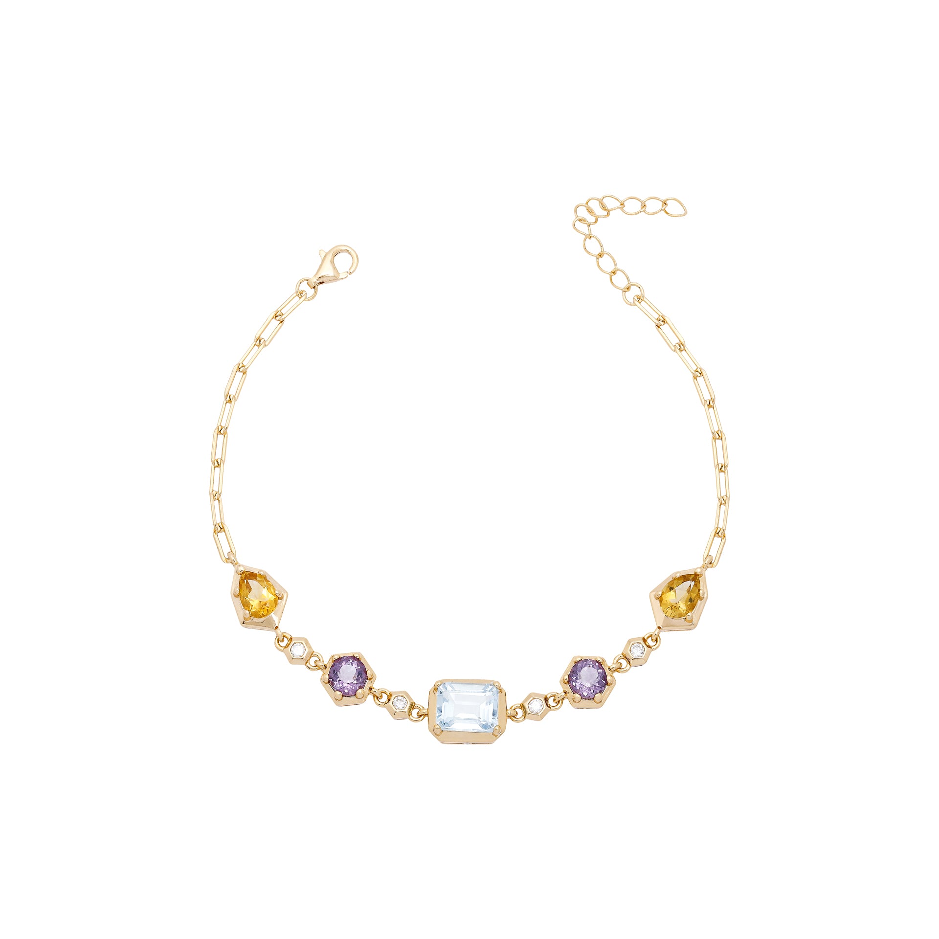 Esta pulseira de prata 925 com banho de ouro 18k apresenta pedras naturais como topazio azul, citrino e ametista, e ainda conta com moissanites que aprimoram a sua beleza. Com 15 cm e extensores adicionais que chegam a 20cm, essa pulseira garante um ajuste perfeito e elegante para qualquer ocasião.